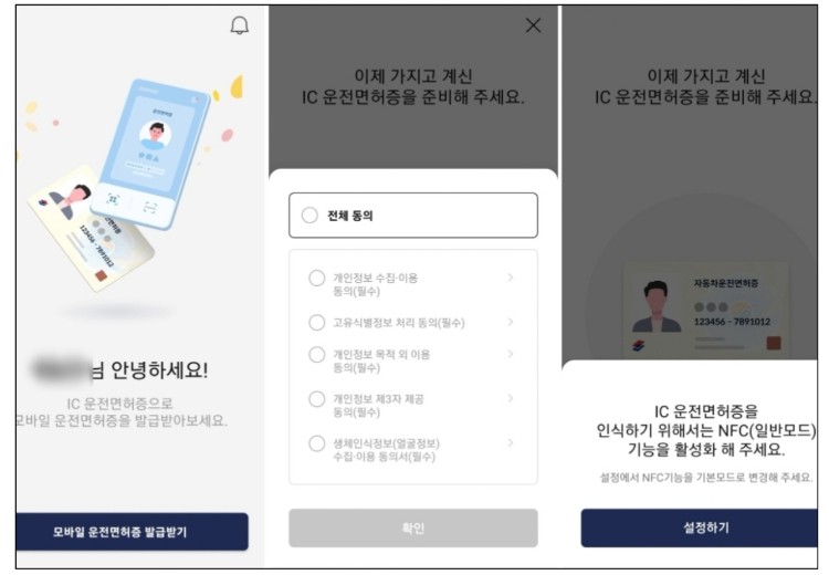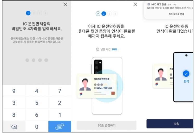 ⑧ 인증 절차에 따라 인증 후 NFC을 킨후 IC 운전면허증을 휴대폰 뒷면에 접촉 태깅 →