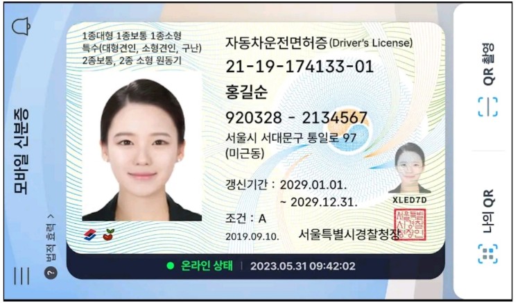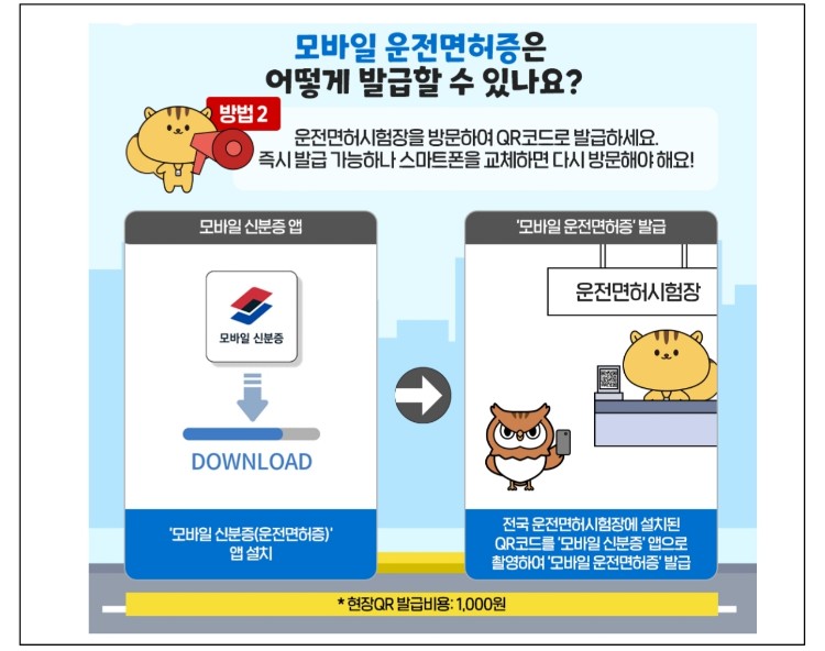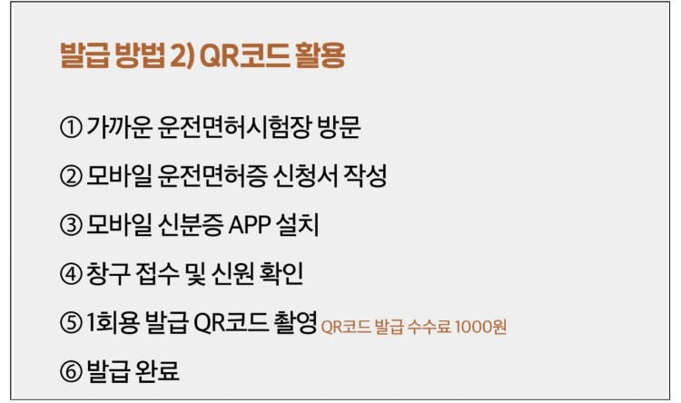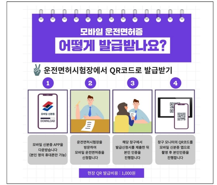 운전면허시험장 창구에 설치된 QR코드를 모바일 신분증 앱으로 촬영하여 발급받는 방식입니다. QR 발급 비용은 1000원입니다. 스마트폰 교체나 분실 시 모바일 운전면허증을 다시 발급받아야 할 경우 운전면허시험장을 재방문해야 합니다.