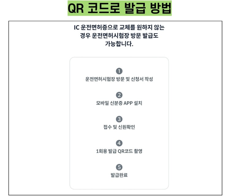 ① 기존 운전면허증을 IC 운전면허증으로 교체후 발급받는 방법과 ② 기존 운전면허증 교체없이 운전면허시험장을 방문해서 현장에서 큐알(QR) 코드로 발급받는 2가지 방법 중 선택할 수 있습니다.