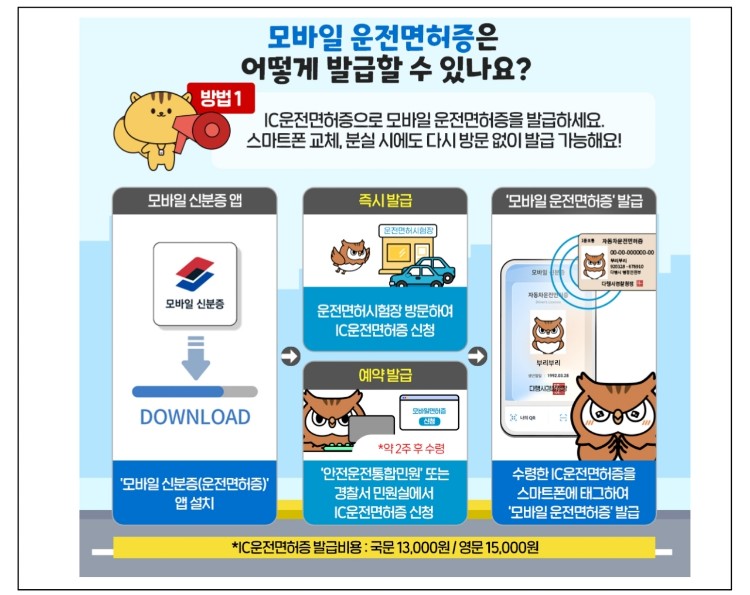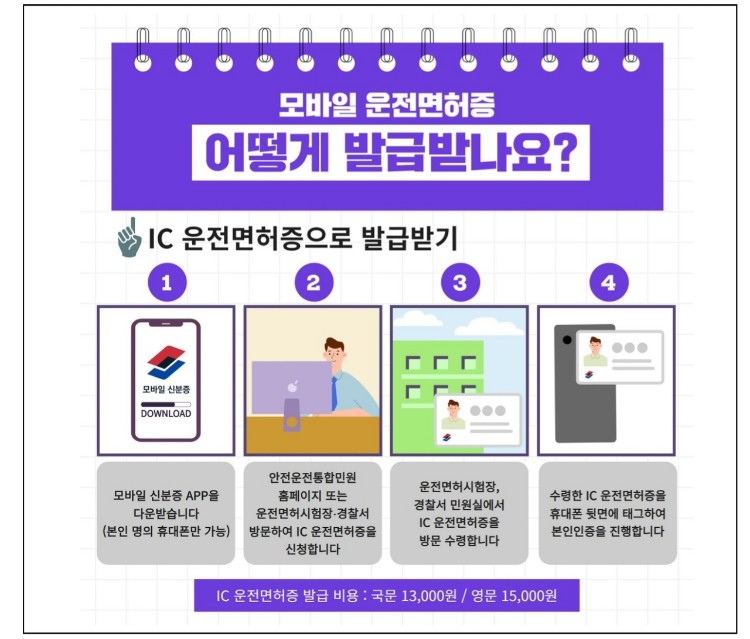 IC 운전면허증 발급 비용은 국문 13000원, 영문 15000원이며, 휴대폰 교체, 분실 시에도 다시 방문 없이 모바일 운전면허증을 발급 받을 수 있습니다.