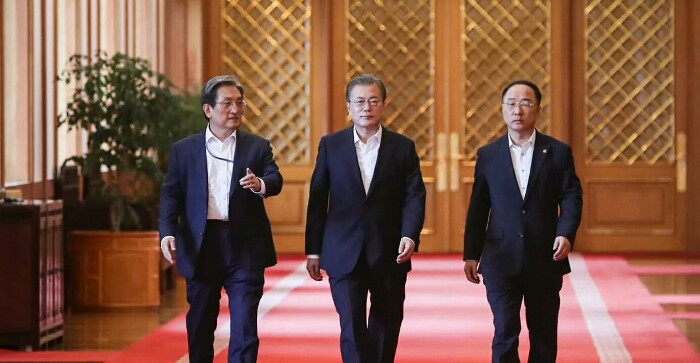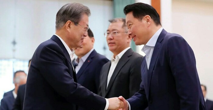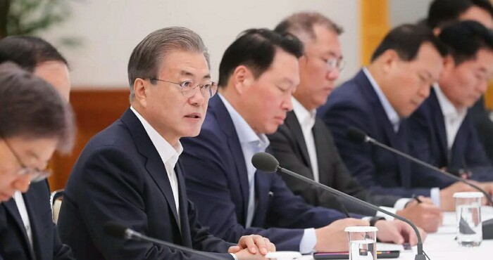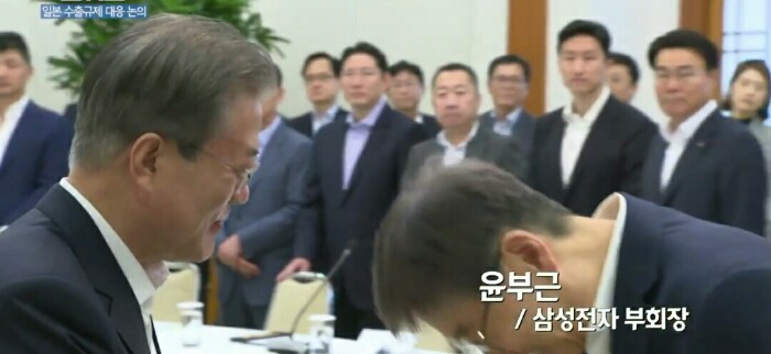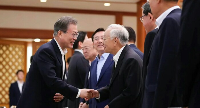 문재인 대통령은 2019년 7월10일(수) 오전 10시30분~오후 12시30분까지 2시간 동안 청와대 본관 충무실에서 한국 경제를 이끌어가는 기업의 최고경영들인 삼성, LG, 현대, SK, 한국무역협회, 한국경총 등 경제계 주요 인사 34명을 청와대에 초청해 간담회를 가졌습니다.