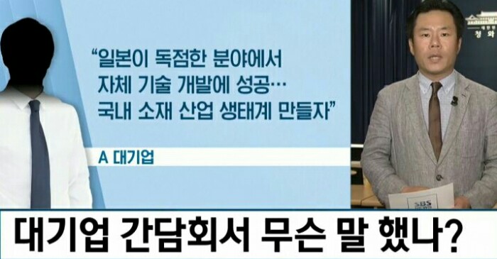끝으로 문재인 대통령은 최대한 정부가 뒷받침할 테니 대외의존도를 낮추기 위한 주요 기업 간 공동기술 개발, 대기업, 중소기업 간 부품기술 국산화 협력 확대 등을 통해 한국 경제가 한 단계 업그레이드되는 계기로 삼아 달라고 당부했습니다.