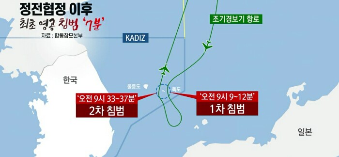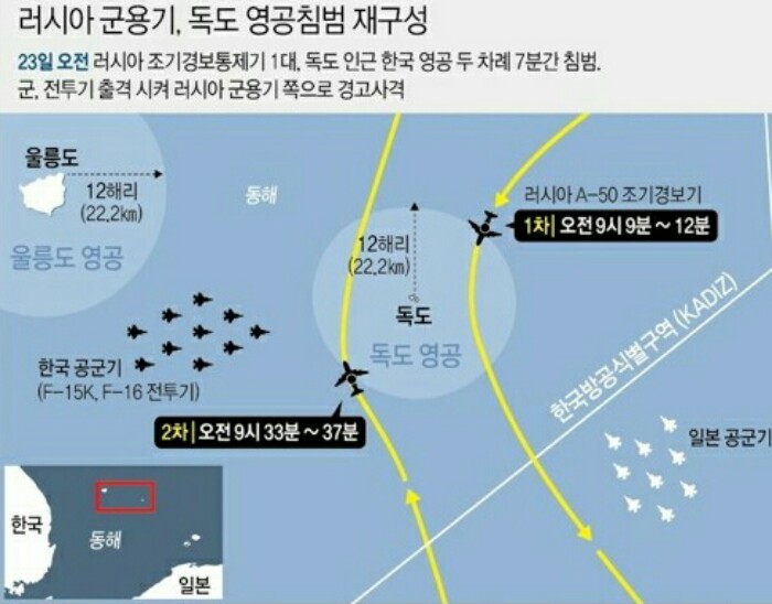 러시아 A-50 조기경보기는 9시9분~12분까지 1차로 독도의 영공을 침법했습니다. 한국 공군은 F-15K, F-16 전투기로 즉각 차단에 나섰고 360여발의 경고사격을 가했습니다.