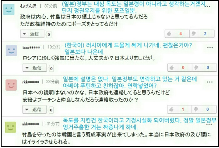 - 일본은 자기네 영해 침범했다고 난리치던데 러시아는 일본한테는 사과 안하네. 이로써 러시아는 독도가 한국땅임을 인정. 아베 똥됐네.
