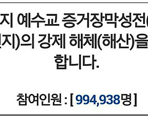 신천지 예수교 증거장막성전의 강제 해체 해산 청원이 100만명을 돌파한다. 와 눈물 날것 같아요. https://www1.president.go.kr/petitions/585290 2월 22일 신종코로나가 급속도로 확산된 배경으로 지목된 신천지예수교회를 강제로 해체 해산해야 한다는 내용의 청와대 국민청원이 올라온지 하루 만인 2월 23일 34만명을 넘어, 2월 24일 16시 신천지 청원은 53만6241명으로 이 추세면 60만명 넘을 것으로 예상된다. 2월 27일 11시준 99만3426명이 넘어가고 있습니다. 내일이면 100만명을 넘을 것으로 예상됩니다. 위기가 닥치면 언제나 그래듯이 어려움을 떨쳐 일어나는 독특한 유전자를 가진 대한민국 국민들 존경합니다. 다음은 신천지 강제 해체 청원자의 청원 내용입니다..