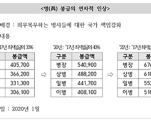 2020년 국방부는 확고한 군사대비 태세를 유지한 가운데 장병들의 삶의 질을 개선하고 국민들의 편익을 증진시키기 위해 2020년 장병 인사 및 복지 분야, 병무, 방산 분야 등에서 제도를 개선했습니다. 다음은 2020년 달라지는 국방 관련 주요 내용입니다. 1. 병(兵) 봉급 인상 (2020년 1월) 병사의 봉급을 2019년 대비 33% 인상했습니다. 병역의무 이행자에 대한 합리적 보상 및 국가 책임강화 차원에서 병사의 봉급을 점진적으로 인상할 계획입니다. 2019년 대비 33% 인상하여 2020년 병장 기준 월급 540,900원을 지급하게 됩니다. 이병 월급은 408100원, 일병 월급은 441700원, 상병 월급은 488200원으로 안상됩니다. 2022년까지 병장 기준 676,100원으로 인상할 예정..