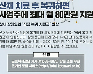 2020년 1월 1일부터 산재근로자 직장복귀 시 사업주에게 지원되는 직장복귀지원금이 최대 월 80만원까지 인상됩니다. 사업주는 장해 1~3급 산재근로자 복귀 시 80만원, 4~9급 산재근로자는 60만원, 10~12급 산재근로자는 매달 45만원을 최대 1년까지 지원받게 됩니다. 산재근로자 직장복귀지원금 직장복귀지원금은 장해 1~12급 산재근로자를 직장에 복귀시켜 6개월 이상 고용을 유지한 사업주에게 임금을 지원하는 제도입니다. 직장복귀지원금은 산재근로자의 원활한 직장복귀와 사업주의 부담을 줄이기 위해 2003년 도입되었으나 2006년 지원금 인상 후 현재까지 지원수준이 유지되어 사업주의 혜택이 낮다는 지적이 있어 왔습니다. 이에 따라, 유사 지원제도와의 형평성을 고려해 장해 4~9급 산재근로자가 고용촉진장..
