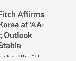 2019년 8월9일(금) 오전, 국제신용평가사 피치(Fitch)는 한국의 국가신용등급과 전망을 현재 수준 AA-, 안정적으로 유지한다고 발표했습니다. Fitch 원문 링크 : https://www.fitchratings.com/site/pr/10085536 Fitch는 한국 신용등급 AA- 이 북한 관련 지정학적 위험과 고령화, 저성장에 따른 중기 도전과제 하에서 양호한 대외·재정건전성, 지속적인 거시경제 성과를 반영하고 있다고 평가했습니다. ① 피치 (Fitch)가 발표한 한국 경제 성장 부분 평가 글로벌 경제 둔화 및 미중 무역긴장의 영향으로 성장 모멘텀이 상당히 둔화되었으나, 근본적인 성장세는 건전하며 유사 등급 국가 수준에 부합한다고 평가했습니다. 2019년 반도체 부진 심화에 따른 수출과 설비투..