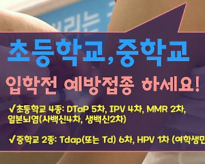 초등학교(4종) 중학교(2종) 입학전 필수 예방접종하고 입학하세요(DTaP,MMR, IPV,HPV,Tdap,일본뇌염)